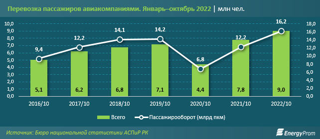 За январь — октябрь текущего года воздушным транспортом перевезли девять миллионов человек — на 15,8% больше, чем годом ранее. Самые высокие показатели были зафиксированы в Алматы: 6,1 млн человек, плюс 11% за год. Следом идут Шымкент (2,4 млн человек) и столица (467,1 тыс. человек).