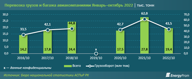 Перевозки груза и багажа воздушным транспортом по итогам десяти месяцев составили 19,4 тысячи тонн — на 30,4% меньше, чем годом ранее. Весь объём перевозок пришёлся на три региона — Алматы (11,7 тысячи тонн), Шымкент (4,7 тысячи тонн) и Астану (три тысячи тонн).