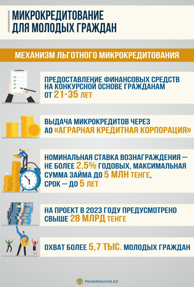 С 1 января 2023 года во исполнение поручения главы государства в рамках Нацпроекта по развитию предпринимательства на 2021-2025 годы внедрен новый механизм льготного микрокредитования для молодых казахстанцев. Финансовые средства будут предоставляться на конкурсной основе гражданам от 21 года до 35 лет, желающим начать собственное дело либо уже занимающимся предпринимательством, в том числе производством или реализацией товаров, выполнением работ и оказанием услуг, производством продукции в личном подсобном хозяйстве и других.