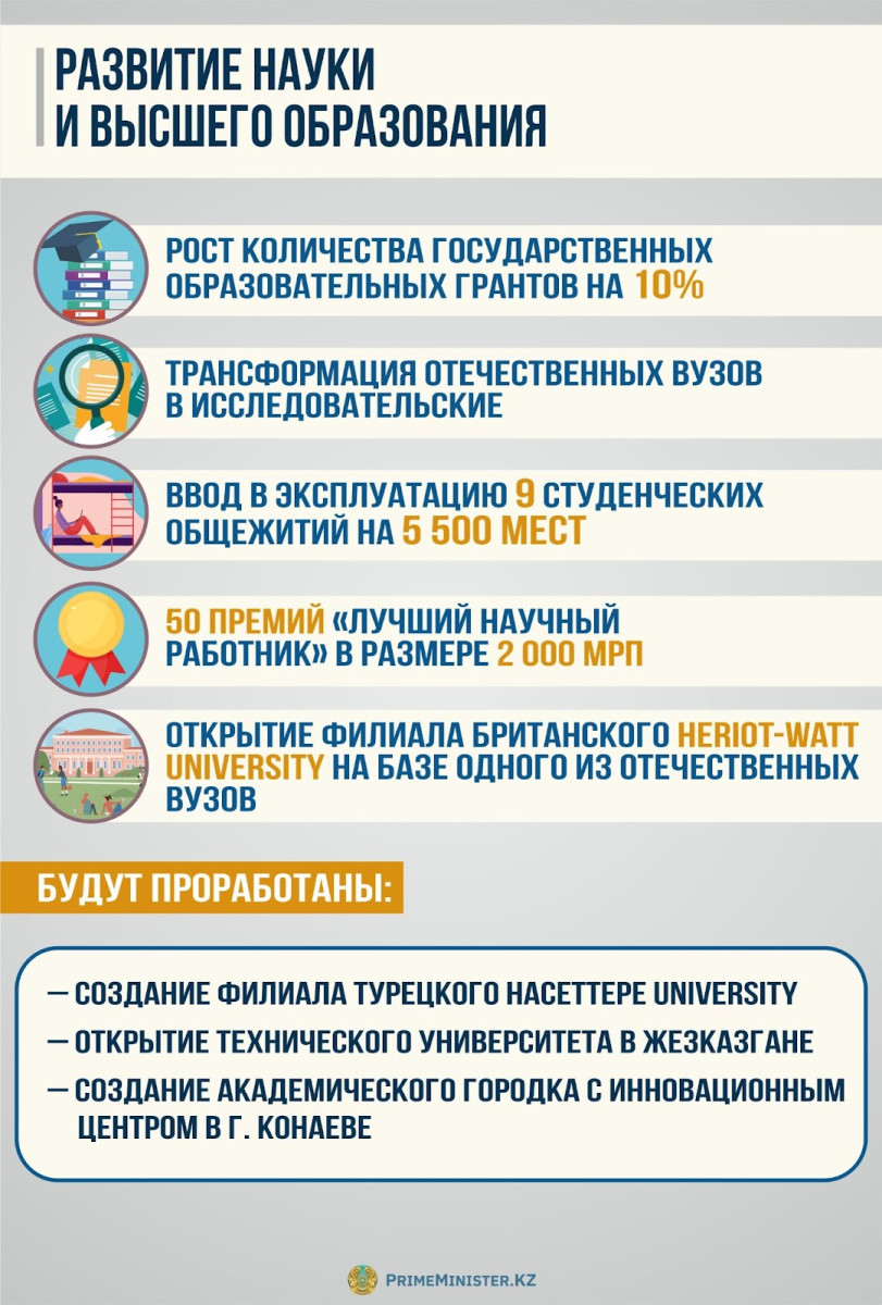 Особое внимание будет также уделено развитию науки и высшего образования в новых регионах республики. Так, в рамках исполнения поручения Главы государства будут проработаны вопросы открытия технического университета в Жезказгане и создания академического городка с инновационным центром в г. Конаеве.