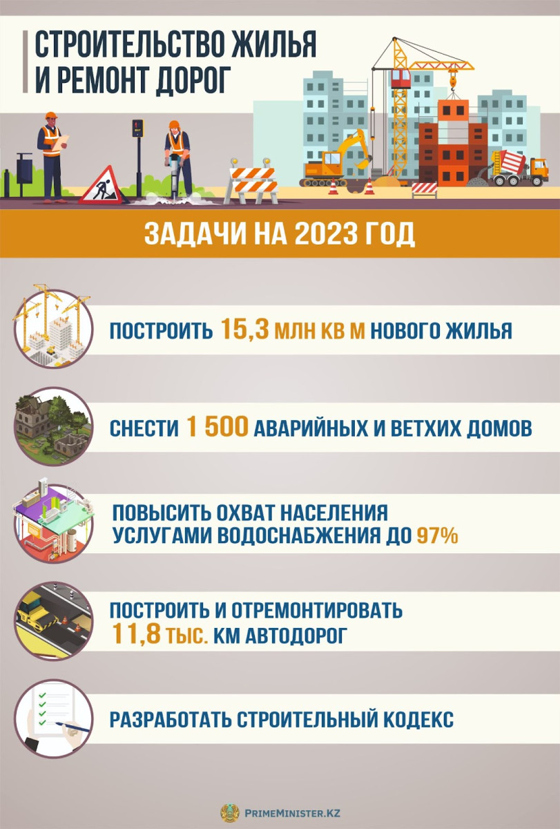 В 2023 году по республике предусмотрено строительство 15,3 млн кв. метров нового жилья. В регионах будут приняты местные программы реновации по сносу 1 500 аварийных и ветхих домов. Кроме того, охват населения услугами водоснабжения планируется повысить до 97%. Уровень очистки сточных вод в городах республиканского и областного значения должен быть увеличен до 80%, а обеспеченности общедомовыми приборами учета тепла и воды – до 83%.