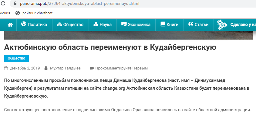 Материал с новостью "Актюбинскую область переименуют в Кудайбергенскую" на сайте "Панорамы" был опубликован 2 декабря 2019 года. Отметим, что заголовок материала несколько противоречит тексту новости, поскольку в нем написано, что переименуют в "...Кудайбергенскую" область, тогда как в тексте написано "...Кудайбергеновскую".