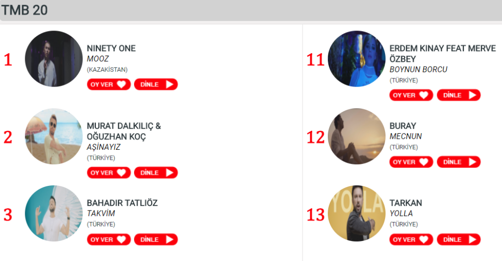 Музыкальный чарт на телеканале ТМВ (Turkish Music Box) представил музыкальные новинки, полюбившиеся публике. Первое место в этом рейтинге заняли парни из группы Ninety One, передает корреспондент BNews.kz.