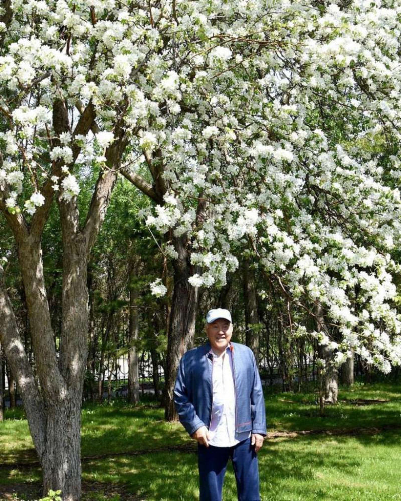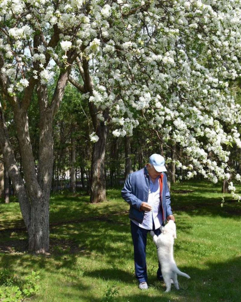 Елбасы запечатлен на фоне пышно цветущих деревьев, на одном из снимков рядом с ним собака. Фотографии сопровождены цитатой Нурсултана Назарбаева: