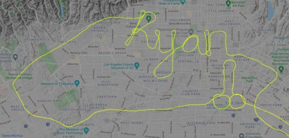 Пролетая над районом Голливуд пилот строил маршрут таким образом, чтобы при фиксировании на карте траектория полета складывалась в слово "Ryan".