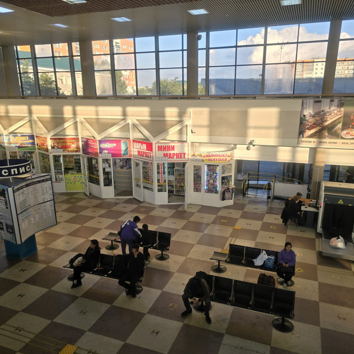 На первом этаже вокзала расположены кассы и бутики. Откровенно говоря, напоминают они ларьки из 90-х. Продают там продукты питания, сувениры, игрушки, товары народного потребления. Здесь же расположены места для ожидания и пункт полиции, а также буфет, который тоже имеет советский колорит.