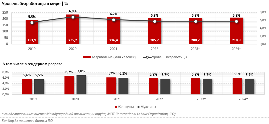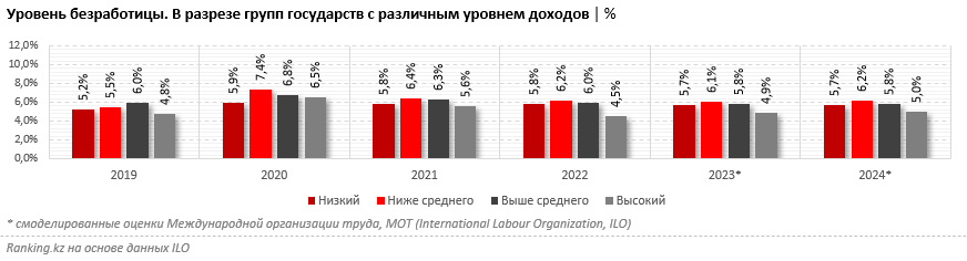 В странах с уровнем доходов выше среднего (куда, помимо Казахстана, к примеру, входят также Россия, Турция и Китай) уровень безработицы в 2022 году составил шесть процентов, а в 2023-2024 годах, по прогнозам МОТ, он уменьшится до 5,8 процента.