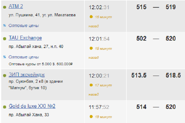 Самый дорогой на данный момент доллар в Алматы, Уральске и Шымкенте, где максимальная цена продажи составила 520 тенге. Минимальная стоимость продажи доллара обменниками в этих городах составляет в основном 514-517 тенге, но в Уральске можно найти и по 506. Покупают обменники эту валюту в Шымкенте, Уральске и Алматы по 507-515 тенге, есть варианты по 503-504 тенге и даже по 501.