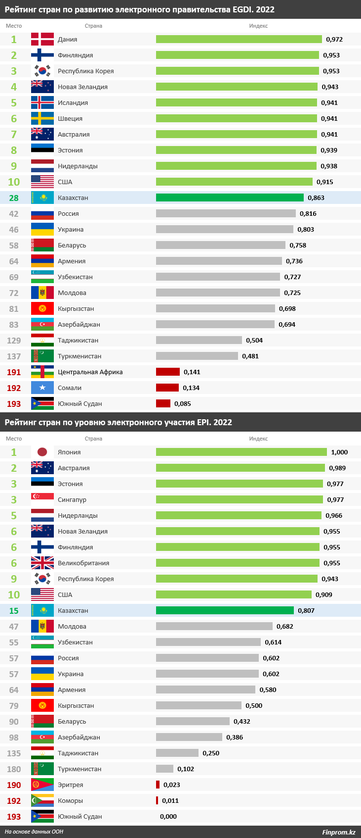 Индекс страны (E-Government Development Index - EGDI) составил 0,86 пункта. Это самый высокий показатель среди стран СНГ и ЦА, кроме того, Казахстан заметно обгоняет такие развитые страны как Ирландия, Канада, Италия, Бельгия, Чехия и другие.