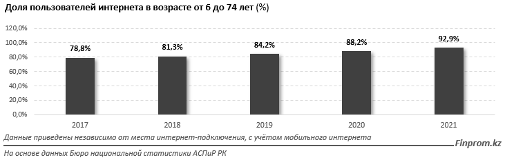 Напомним: в 2021 году доля пользователей интернета (с учётом мобильного соединения) в возрасте от 6 до 74 лет составила в РК сразу 92,9 процента, что на 4,7 п. п. выше по сравнению с 2020 годом. Кроме того, значительно сократился разрыв в разрезе местности. Так, в сельской местности показатель увеличился с 85,5 процента в 2020 году до 90,7 процента в 2021 году, а в городской местности — с 90,1 процента до 94,4 процента, что сократило разрыв с 4,6 п. п. до 3,7 п. п. между городом и селом.