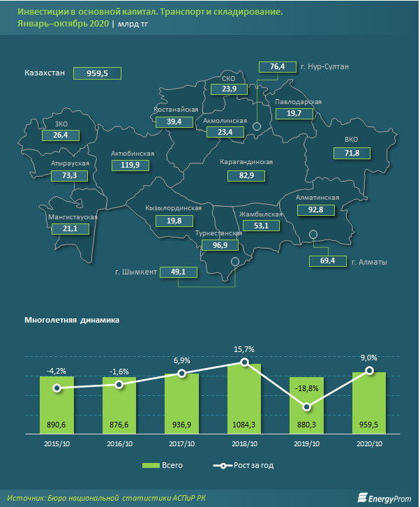 За январь-октябрь 2020 года в сферу транспорта и складирования проинвестировали 959,5 миллиарда тенге – на девять процентов больше, чем годом ранее. Реальный рост физического объема капвложений составил 8,4 процента.