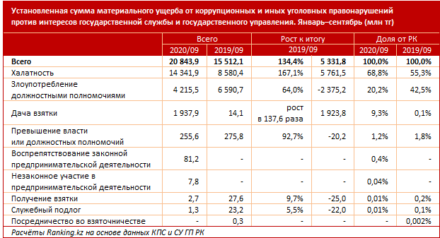 Установленная сумма материального ущерба от коррупционных и иных уголовных правонарушений против интересов госслужбы и госуправления по итогам девяти месяцев составила 20,8 миллиарда тенге – на 34,4 процента больше, чем годом ранее.