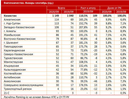 "В том числе 603 правонарушения пришлись на получение взятки, 500 – на дачу, 46 – на посредничество. В разрезе регионов больше всего правонарушений в сфере взяточничества было зарегистрировано в Алматинской области: 114 случаев против 69 годом ранее, рост – в 1,7 раза за год.