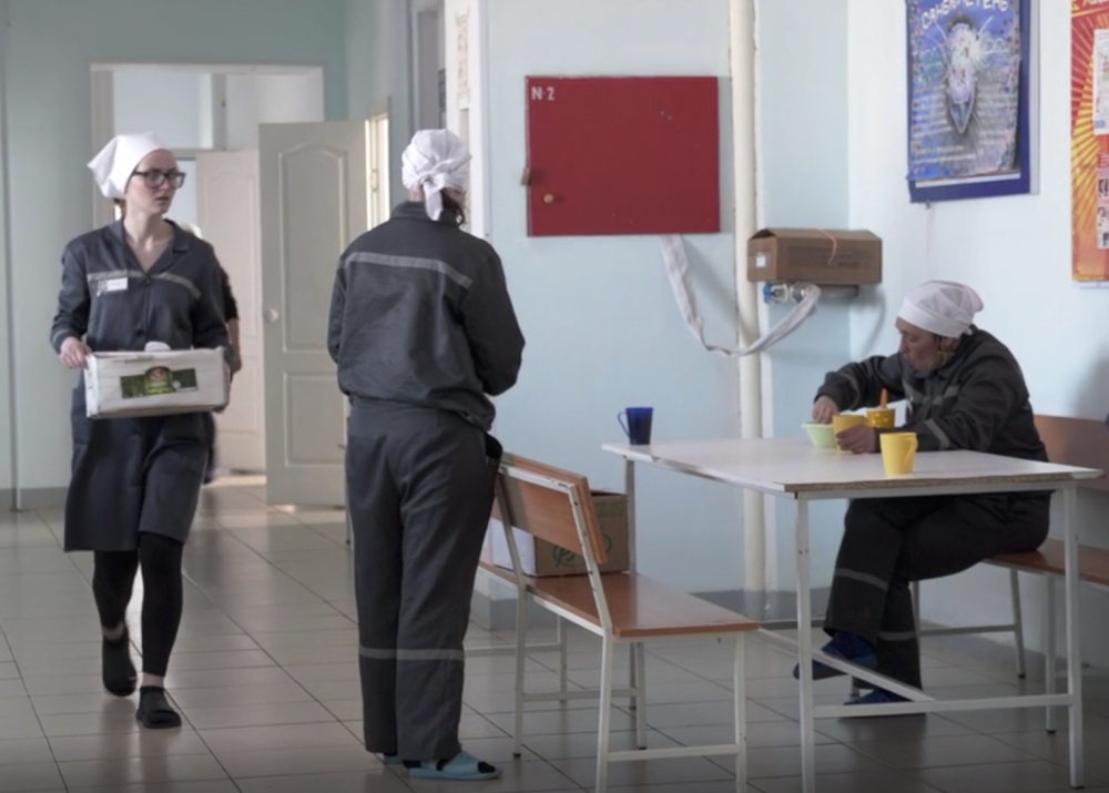 Вместе с начальницей отделения воспитательной и социально-психологической работы среди осужденных учреждения ЕС-164/6 Оксаной Вышар мы посетили производственную зону. Здесь во второй половине дня заключенные работают и зарабатывают деньги, чтобы погасить долги по искам либо помочь родным. По словам Вышар, средняя зарплата заключенных составляет 42 000 - 46 000 тенге.В целом здесь расположены три базы. На первой базе шьют полиэтиленовые плащи, подушки и одежду для заключенных. На второй базе разводят кур-несушек. Запах здесь стоит очень сильный, медицинский маски совсем не спасают. Напоминает вонь от протухших яиц. Хотя кругом все было достаточно чисто. Здесь также разводят кроликов. Кроме кур и кроликов на производственной территории пасутся пони и два теленка.