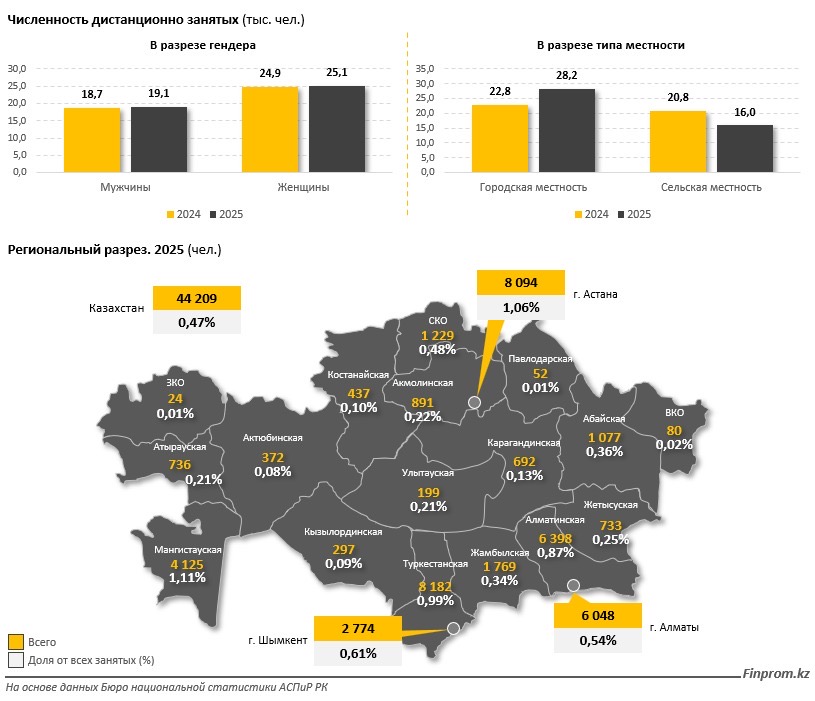 Удалённая занятость в основном сосредоточена в городах. В 2025 году в городской местности работали 28,2 тысячи человек, тогда как в сельской местности — 16 тысяч человек. Такая разница объясняется уровнем развития цифровой инфраструктуры и доступом к высокоскоростному интернету.