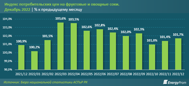 Для сравнения: по итогам декабря 2021 года цены на овощные и фруктовые соки выросли на 0,9 процента за месяц.