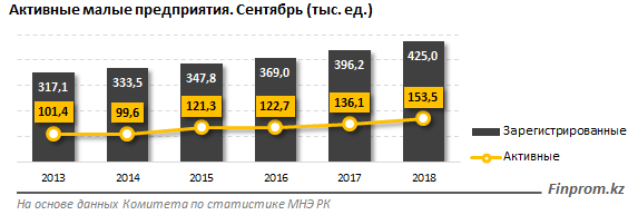 Количество активных малых предприятий на конец сентября составило 153,5 тыс, что на 12,8% больше, чем годом ранее - 136,1 тыс компаний. Последние четыре года малый бизнес планомерно пополняется все новыми активными предприятиями. Так, к примеру, в сентябре 2014 их число составляло всего 99,6 тыс, говорится в исследовании Finprom.kz.