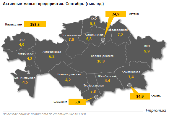 Главные концентраторы казахстанского малого бизнеса - Алматы - 34,9 тыс предприятий (годом ранее - 31,5 тыс) и Астана - 24,9 тыс (годом ранее - 16,4 тыс). Их доля составляет 39% от общего числа активных малых предприятий.