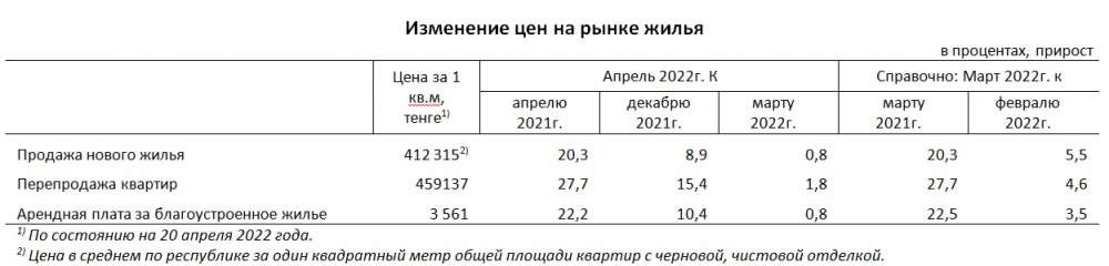 Если сравнивать данные марта и апреля 2022 года, то цены на перепродажу квартир выросли на 1,8 процента, составив 459 137 тенге за квадратный метр жилья на вторичном рынке. Также в апреле 2022 года выросли цены на продажу нового жилья (412 315 тенге за квадратный метр) и арендную плату за благоустроенное жилье (3 561 тенге за квадратный метр).