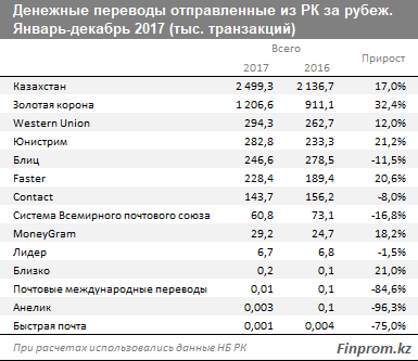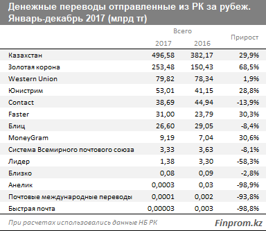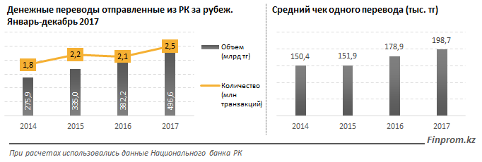 Объем средств, отправленных из РК за рубеж через различные системы международных денежных переводов, составил за январь-декабрь 2017 года 496,6 млрд тг, что на 29,9% больше, чем в 2016 году. Показатели 2016 года в свою очередь обгоняли 2015 на 14,1%, и достигли 382,2 млрд тг, сообщает finprom.kz.
