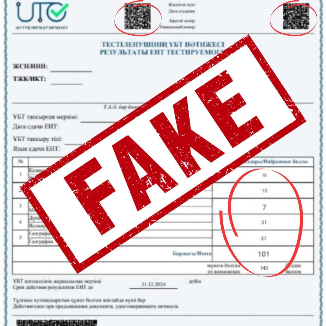 "В этом году зафиксированы случаи предоставления поддельных сертификатов ЕНТ. Идёт приём документов на конкурс грантов, и уже зарегистрировано более 10 попыток представить фальсифицированные сертификаты в приёмные комиссии. Важно отметить, что подделка сертификата ЕНТ невозможна. Каждый документ содержит уникальный QR-код, который позволяет мгновенно проверить его подлинность. Кроме того, сертификат ЕНТ является официальным документом, и его подделка влечёт за собой уголовную ответственность по статье 385 УК РК", - сообщили в ведомстве.