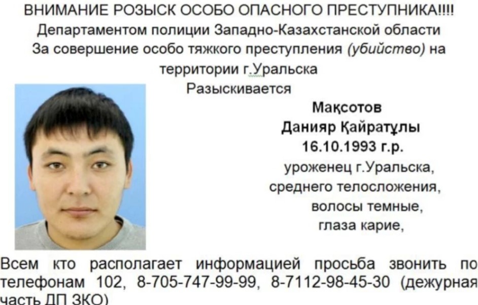 Ориентировку предоставили в пресс-службе департмента полиции ЗКО. В ней говорится, что ищут 31-летнего Данияра Максотова. Подозреваемый среднего телосложения, у него тёмные волосы и карие глаза.