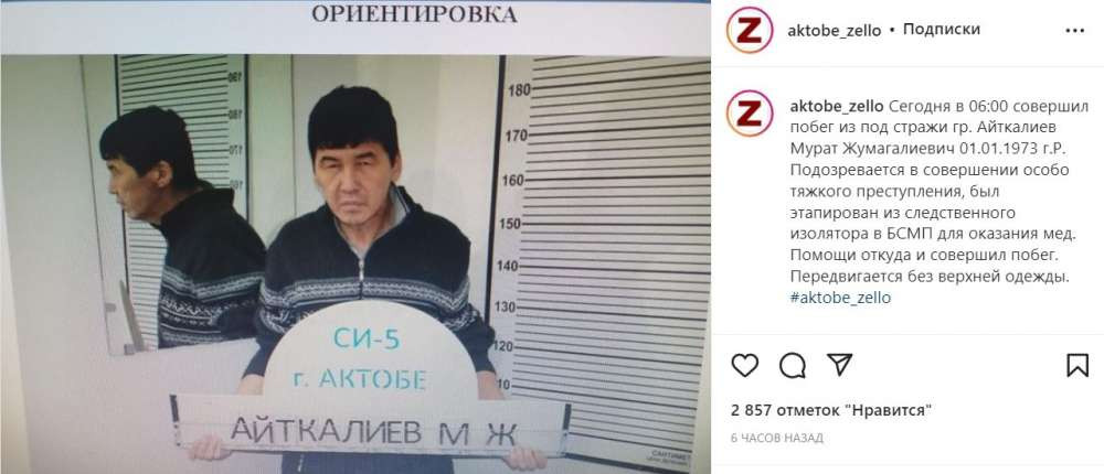 "23 января 2022 года примерно 07:25 следственно-арестованный за совершение особо тяжкого преступления (попытка изнасилования, покушение на убийство) Айткалиев Мурат Жумагалиевич 01 января 1973 года рождения, находясь на лечении в больнице скорой медицинской помощи, совершил побег", − говорится в сообщении.