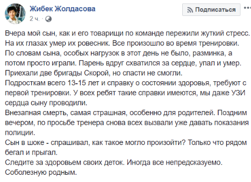 "Вчера мой сын, как и его товарищи по команде, пережили жуткий стресс. На их глазах умер их ровесник. Все произошло во время тренировки. По словам сына, особых нагрузок в этот день не было, разминка, а потом просто играли. Парень вдруг схватился за сердце, упал и умер. Приехали две бригады скорой, но спасти не смогли", - пишет в своём посте Жолдасова.