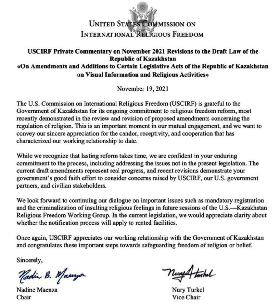 В письме от имени Комиссии председатель Надин Маенза и его заместитель Нури Туркель выразили признательность правительству страны за неизменную приверженность реформам в сфере свободы вероисповедания, что было вновь подтверждено в обзоре и пересмотре предложенных поправок, касающихся вопроса регулирования религиозной деятельности.