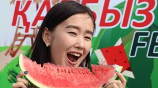 Победительницей в скоростном поедании арбуза среди девушек стала будущая преподаватель казахского языка и литературы из Кызылорды Орнай Байтуганова.