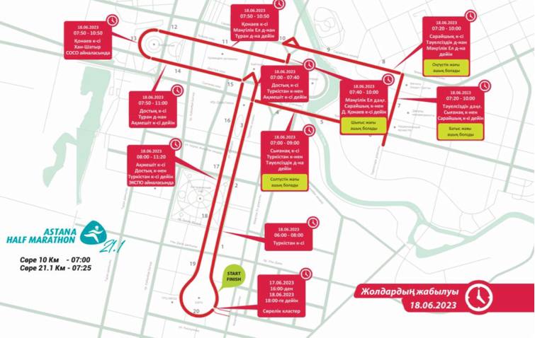 В связи с загруженностью дорог участникам рекомендуют добираться до места старта (МВЦ EXPO) на автобусе до пересечения улицы Рыскулова и проспекта Мангилик Ел. Парковка возле стартового городка (МВЦ EXPO) будет невозможна.