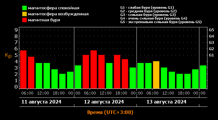 По данным специалистов Лаборатории солнечной астрономии ИКИ и ИСЗФ, магнитные колебания начнутся 12 августа с 3:00, слегка ослабнут днём и снова усилятся к вечеру, окончатся лишь в 21:00. К счастью, весь оставшийся август геомагнитная обстановка будет спокойная: вспышек на Солнце, которые бы повлияли на магнитное поле Земли, не ожидается. А следующую бурю обещают уже 1 сентября.