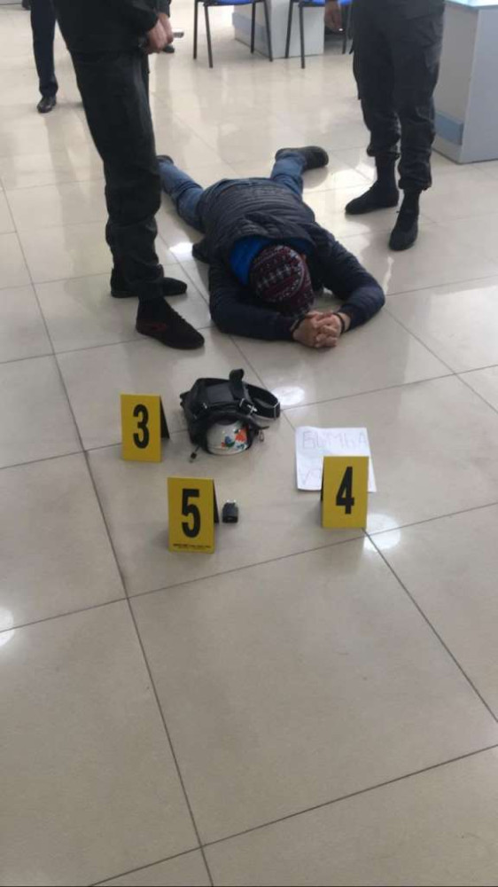 Сотрудник службы безопасности банка Смайл Ажикулов сразу вступил в переговоры с грабителем, пытаясь отговорить его от осуществления задуманного. Воспользовавшись моментом Смайл незамедлительно обезвредил грабителя и изъял самодельную бомбу, которая впоследствии оказалась муляжом.