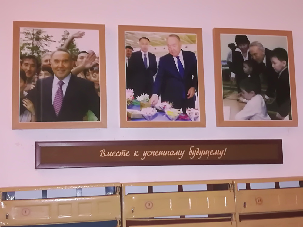 Теперь всех, кто входит в подъезд этой пятиэтажки, встречают три портрета президента Нурсултана Назарбаева и слова «Вместе к успешному будущему!».