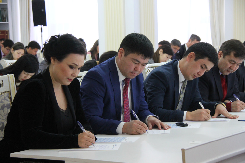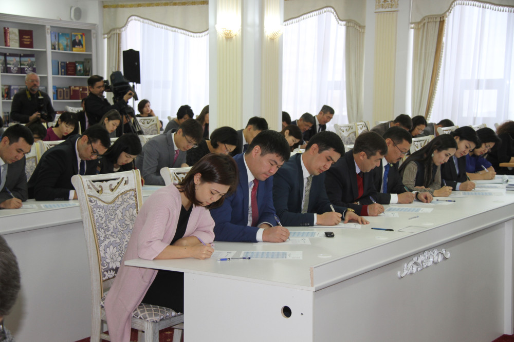 Желающим проверить свой уровень знаний новой версии казахского алфавита было предложено написать текст из 80 слов за 30 минут на тему "Рухани Жангыру". В Астане "особенный" диктант писали общественные деятели, писатели, спортсмены, представители культуры и искусства. Оценки никому не выставлялись, главным было – участие.