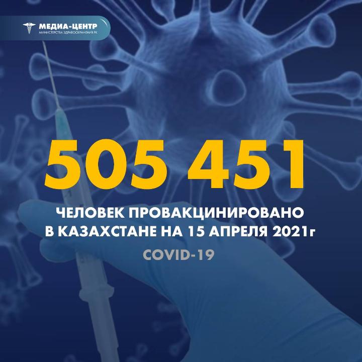 На 15 апреля 2021 года в Казахстане получили прививки от коронавирусной инфекции 505 451 человек Такие данные опубликованы на сайте Министерства здравоохранения РК, передает BaigeNews.kz.