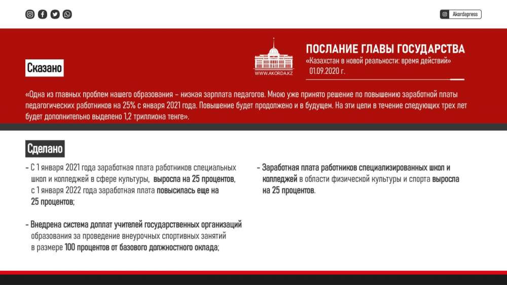 "Одна из главных проблем образования — низкая зарплата педагогов. Мной принято решение по повышению заработной платы педагогических работников на 25% с января 2021 года. Повышение будет продолжено и в будущем. На эти цели в течение следующих трех лет будет дополнительно выделено 1,2 триллиона тенге", — сказал президент в своем Послании в 2020 году.