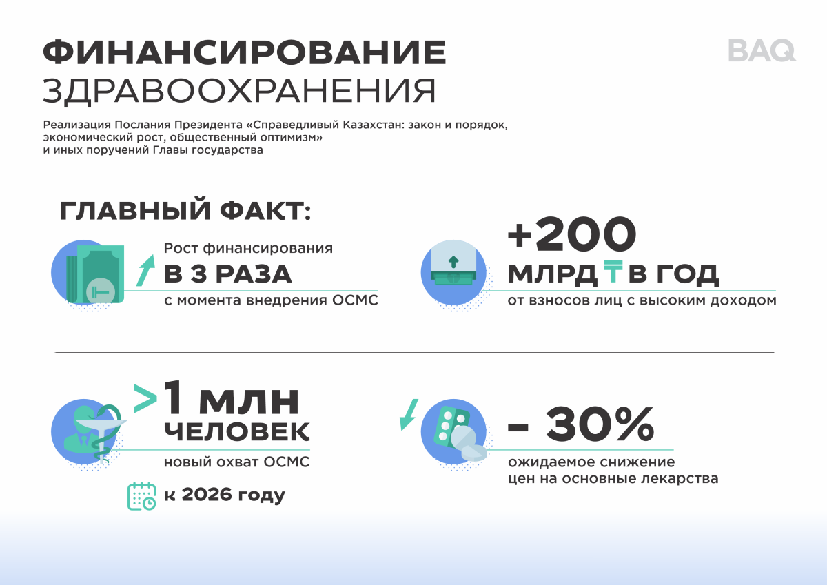 Увеличение государственного финансирования: предусмотрено поэтапное увеличение ставок взносов государства за 11 млн граждан из льготных категорий. Эта мера позволит к 2030 году увеличить финансирование на сумму до 289 млрд тенге.
