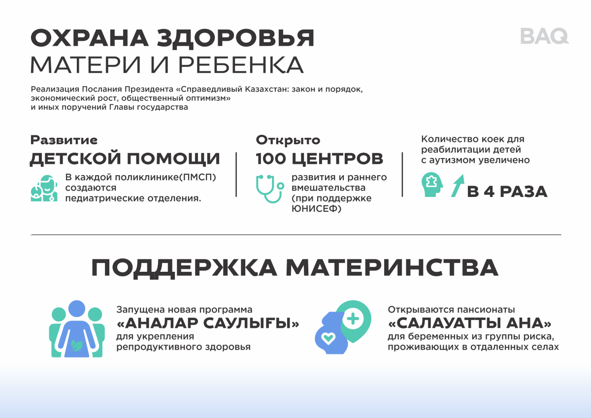 Для поддержки материнства впервые запущена программа "Аналар саулығы", нацеленная на укрепление репродуктивного здоровья женщин. Параллельно для женщин из отдаленных сел открываются пансионаты "Салауатты Ана" для заблаговременной госпитализации беременных из группы высокого риска.