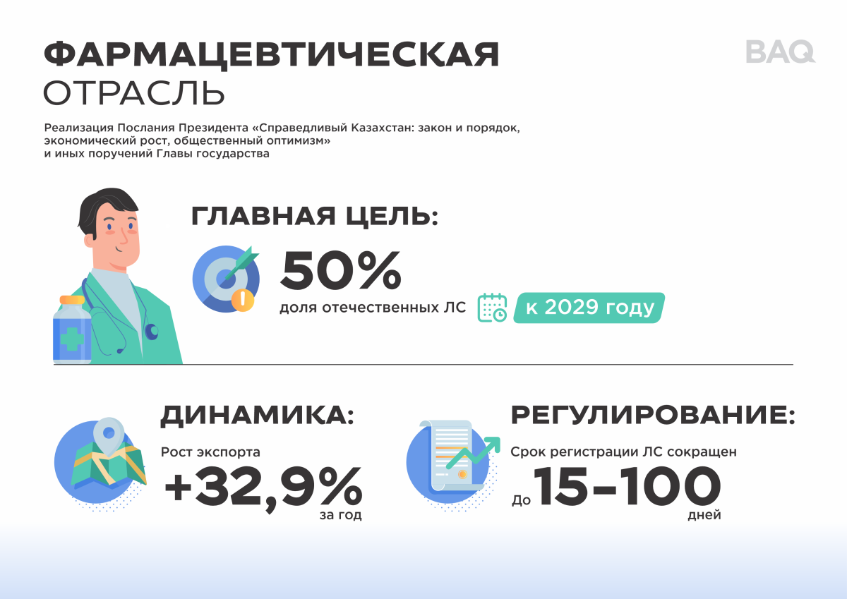 В фармацевтической отрасли принимаются меры по исполнению поручения Президента о доведении доли лекарств отечественного производства до 50% к 2029 году. В целях повышения прозрачности ценообразования пересмотрен механизм формирования предельных цен: исключены излишние расходы и снижены цены на генерики до 30% от стоимости оригинальных препаратов. Только по ТОП-20 высокозатратным препаратам, закупаемым СК-Фармация, ориентировочная экономия составит порядка 18 млрд тенге. В целом, ожидается снижение предельных цен в рамках ГОБМП и системе ОСМС на 19%, в оптовом и розничном сегментах – до 30%.