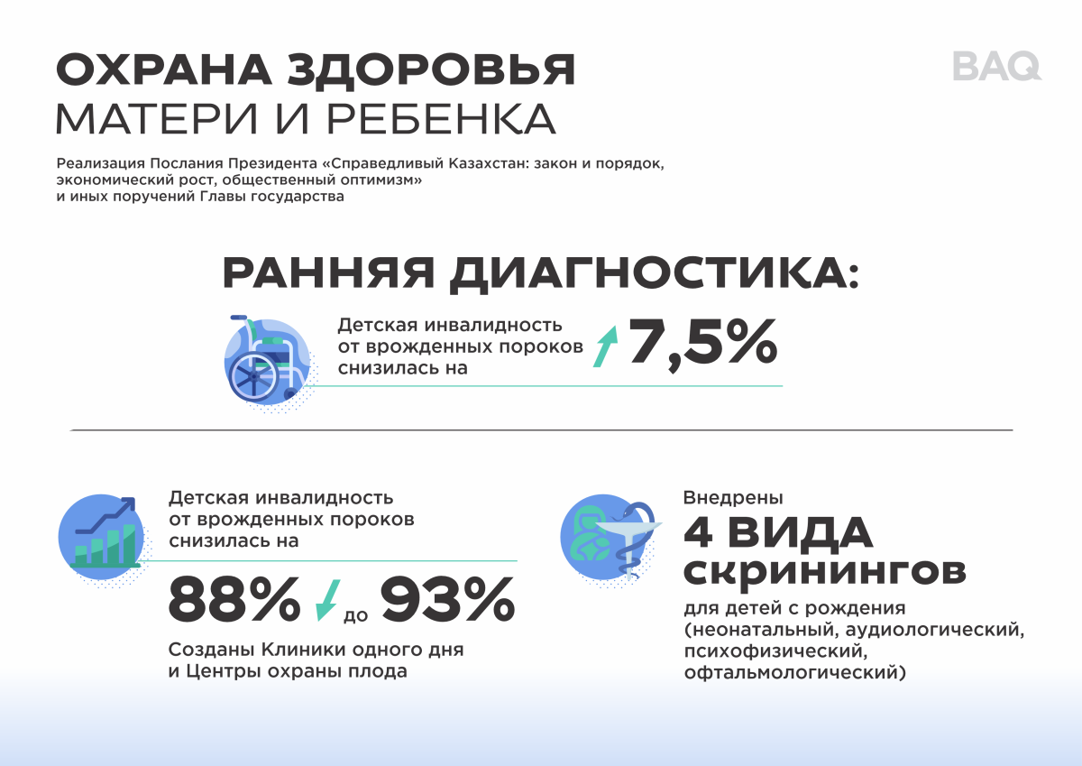 Для раннего выявления патологий в стране создана эффективная инфраструктура – Клиники одного дня, Центры охраны плода. Детям с рождения проводятся четыре вида скринингов: неонатальный, аудиологический, психофизический и офтальмологический. Эта работа уже дала результаты – первичная инвалидность детей с врожденными пороками снизилась на 7,5%, а выживаемость новорожденных увеличилась с 88% до 93%.
