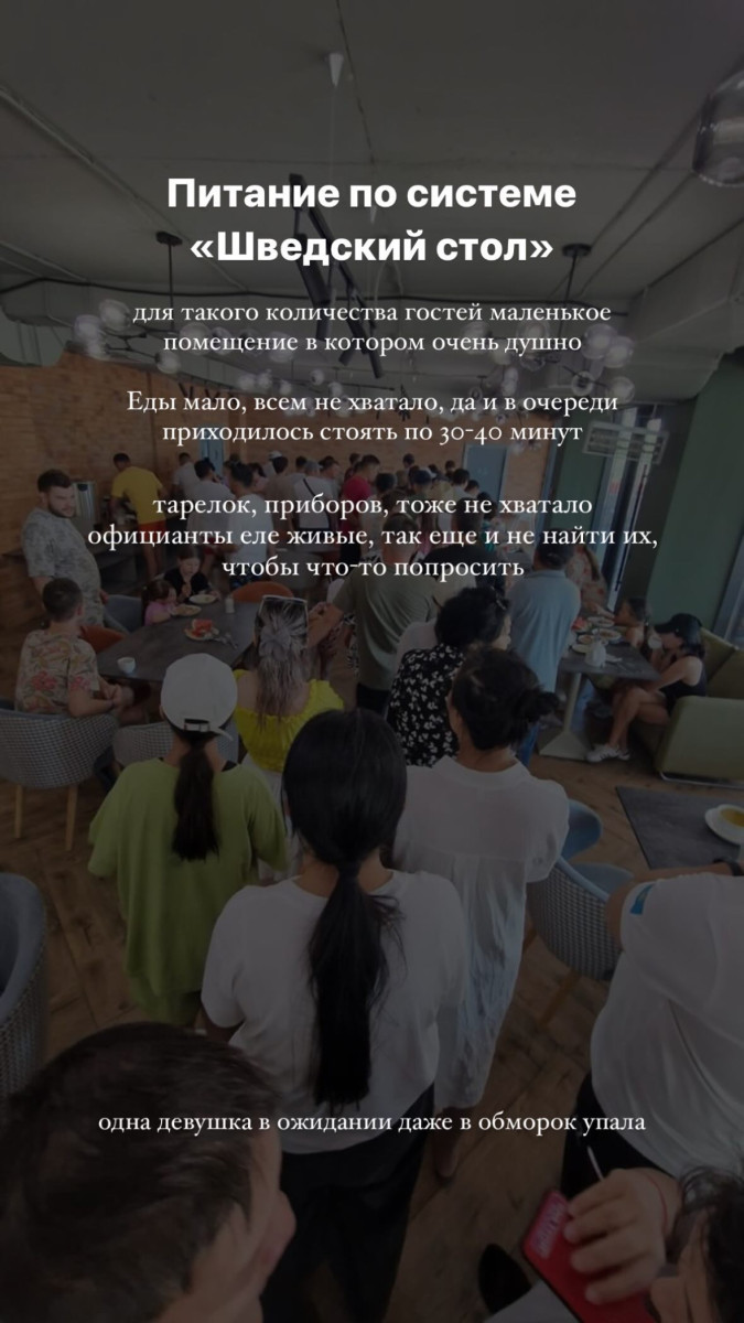 "Лёжа под капельницей и сгорая от температуры, я вообще пожалела, что мы поехали на Балхаш именно в это место. Питание по системе "шведский стол". Для такого количества гостей маленькое помещение, в котором очень душно. Еды мало, всем не хватало, в очереди приходилось стоять по 30-40 минут. Тарелок, приборов тоже не хватало. Одна девушка в ожидании даже в обморок упала", - описала Елена то, что предшествовало болезни.