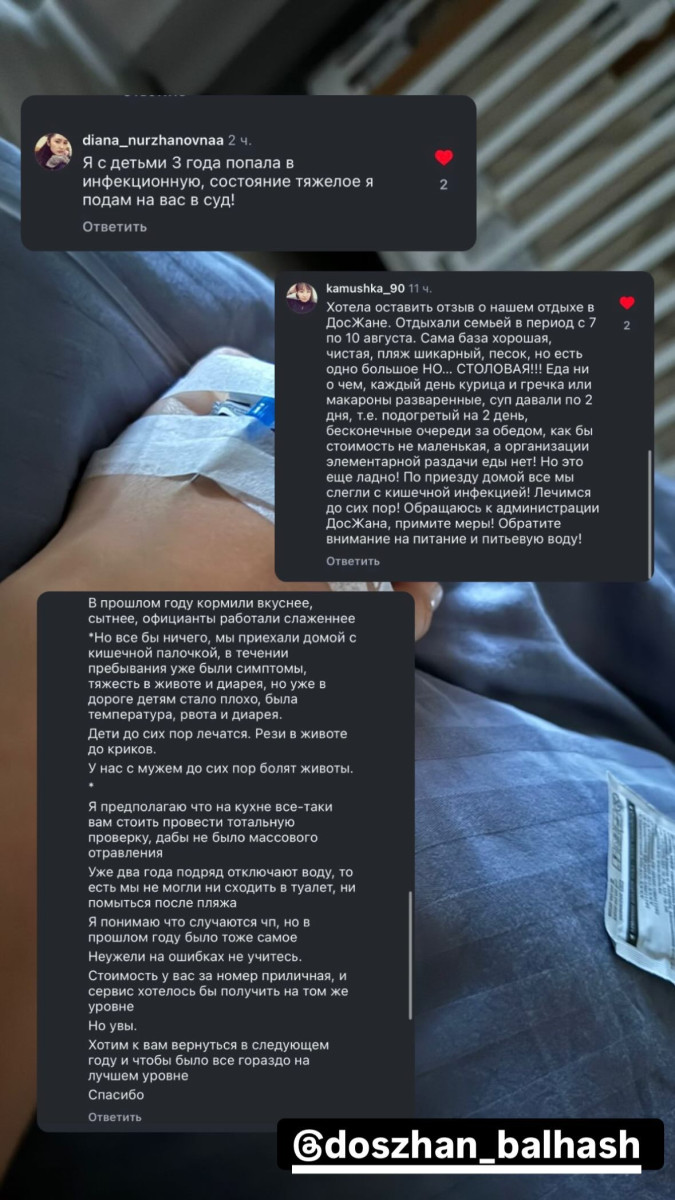 О случившемся в Instagram сообщила гинеколог из Караганды Елена Богданова. Она с семьей ездила отдыхать в пансионат "Досжан", расположенный в в посёлке Чубар-Тюбек, на несколько дней и еле вернулась домой.
