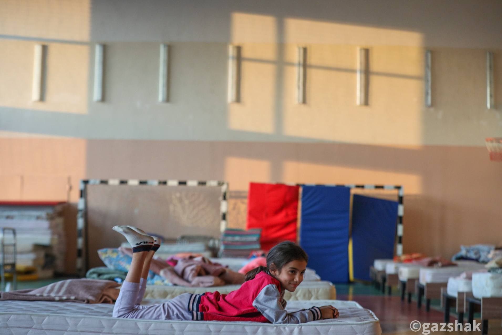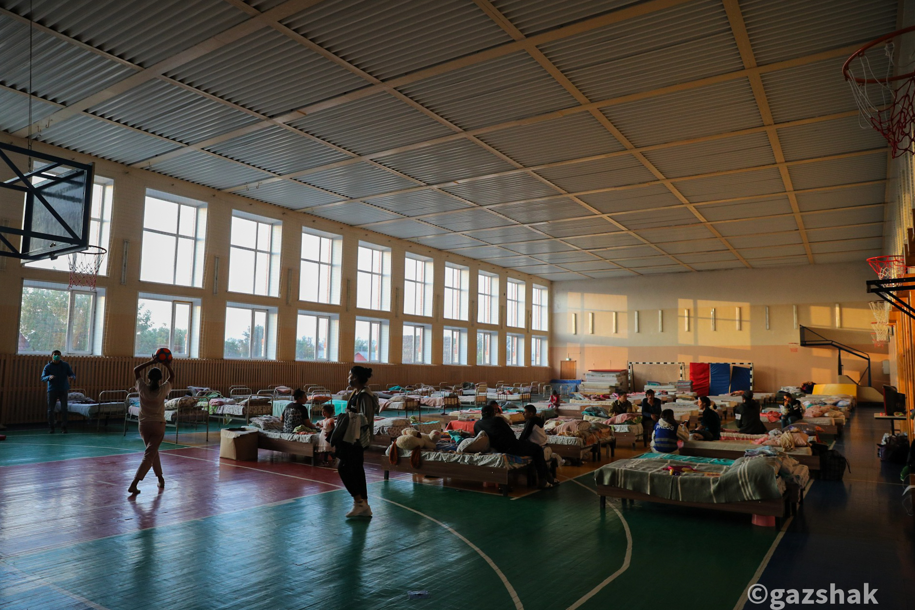 Рядом со стадионом находится школа — один из пунктов эвакуации. Сейчас там осталось всего две семьи. Остальные разъехались по родственникам. У Оксаны и её мужа семеро детей, но родственников, у которых можно было бы временно поселиться, нет.