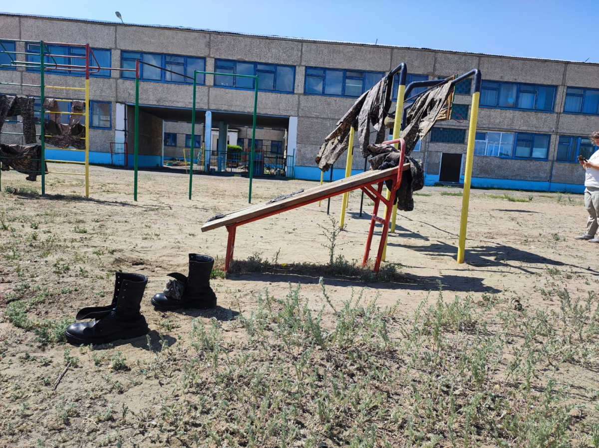 На заднем дворе школы ещё стоят казаны, где женщины варили для бойцов с огненной стихией вкусную еду по-домашнему. В глубине двора, на лавочках загорают и обсуждают события последних дней солдаты-срочники, в стороне на турниках высыхает их форма.
