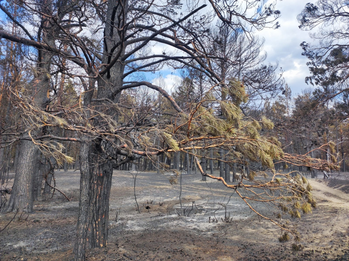 В этой местности уже почти не увидишь зелёных сосен. Всех постигла одна участь. Одни сгорели дотла, лишь обугленные чёрные кроны пугают своей беспомощностью. Другие сохранили опалённые иголки, которые из-за высокой температуры лишились жизненной силы.