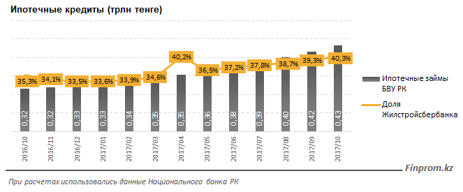 В целом по госстратегии развития доступности жилья в рамках программы «Нурлы Жер» стоит задача восстановить объем ипотечного кредитования БВУ на уровне ежегодной выдачи 150 млрд тенге. По итогам 10 месяцев 2017 года ипотечный портфель БВУ вырос на 85,2 млрд тенге.