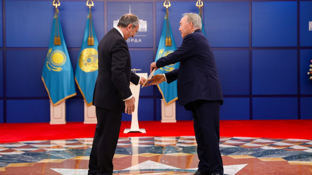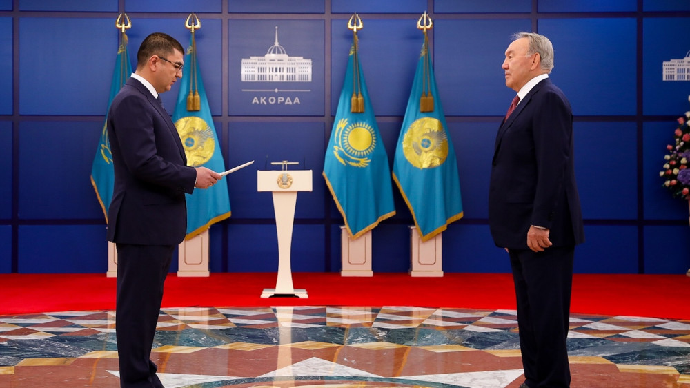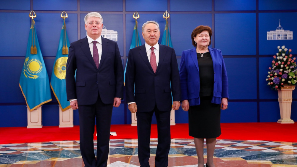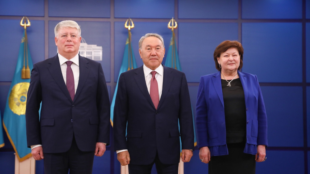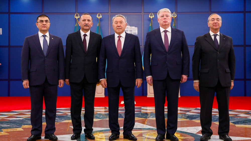 Грамоты Нурсултану Назарбаеву вручили Чрезвычайные и Полномочные послы Узбекистана - Саидикрам Ниязходжаев, России - Алексей Бородавкин, Туркменистана - Тойлы Комеков, Италии - Паскуале д'Авино.