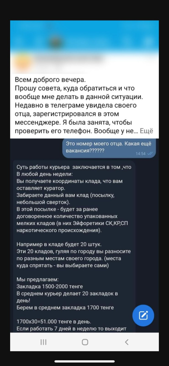 Неприятный сюрприз ожидал еще одну казахстанку. Она в Facebook написала, что недавно узнала о том, как номер телефона ее отца, который даже не имеет выхода в Интернет, зарегистрировали Telegram , причем в канале, где распространяют наркотики.