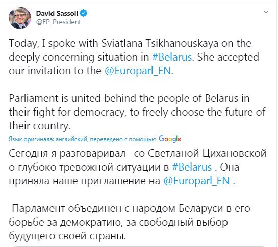 После беседы Сассоли опубликовал в своем Twitter пост о разговоре с Тихановской и Науседой, но позже удалил его.